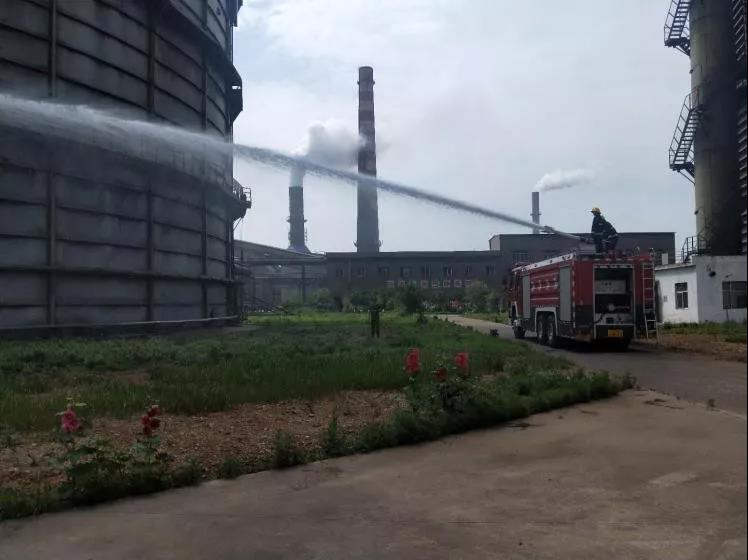 消防車(chē)進(jìn)入煤氣柜區(qū)域,在事故平臺(tái)下方準(zhǔn)備救援。
