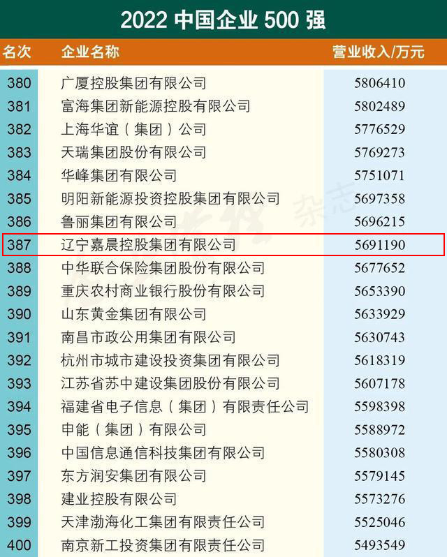 2022中國企業500強嘉晨集團排名第387位